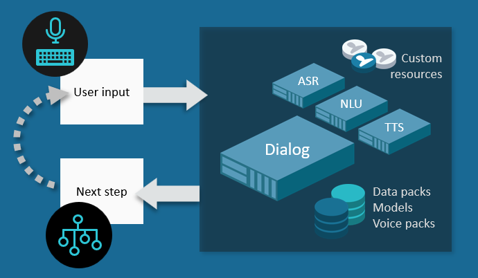 DLGaaS works with a dialog model created with the Mix.dialog tool and a semantic model created with Mix.nlu. For speech conversations, it also calls ASRaaS for speech recognition and TTSaaS or Neural TTSaaS for voice synthesis. As described in Dialog, you build the Dialog model on top of the semantic NLU model by defining what should happen at each step of the conversation given the user’s intent.