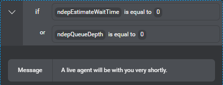 This example shows how you could build conditions based on transfer queue information from NDEP to improve the experience of the end user when the virtual assistant can’t transfer them immediately to a live agent.