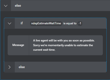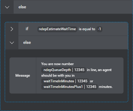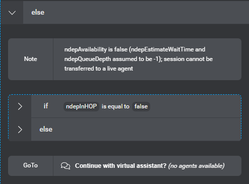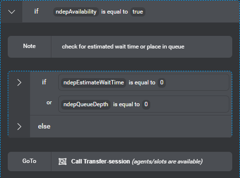 For transfer flows that involve sending agentAttributes (multiple attributes) to NDEP, your virtual assistant should not rely on the estimated wait time, available slots, and queue depth information from NDEP. In such cases, NDEP is likely to return a value of -1 (default) for ndepEstimateWaitTime, ndepAvailableSlots, and ndepQueueDepth. This is a limitation. As a workaround, use ndepAvailability to build your transfer logic.Transfer logic example