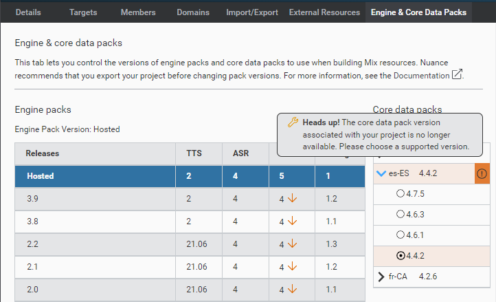- Hosted: Engine pack version that corresponds to the latest ASR, NLU, TTS, and Dialog engines and tooling available in the Nuance-hosted Mix environment.
