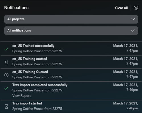 Filter by type of notification: All notifications (default), Completed, Failed, Started, Queued, if desired.
