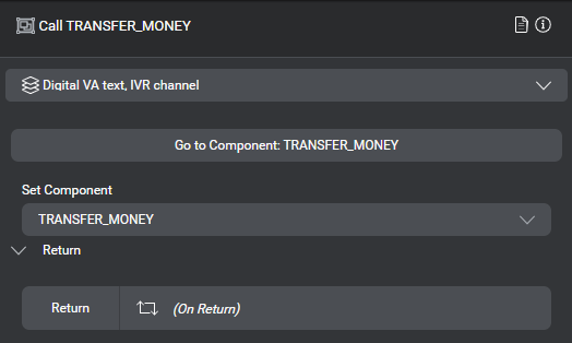 The component call node transfers the dialog flow to the specified component. When the component is finished, the dialog returns to the component call node and proceeds from there.