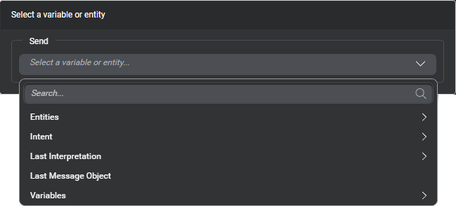 You can send a variable, an entity, the messages from the last visited message node or from the latest step of the last visited question and answer node (Last Message Object), the active intent’s value, confidence score, and literal, or the interpretation results from the last collection and confirmation steps (see Predefined variables for more details).