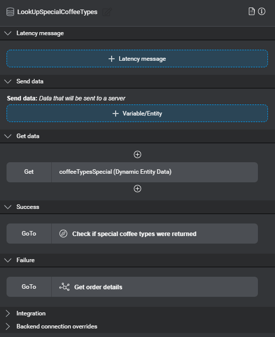 A success return code means that the dialog was able to communicate with the backend. It doesn’t mean that the backend actually returned the desired data. - Set the GoTo transition to perform when the external system returns a failure code.
