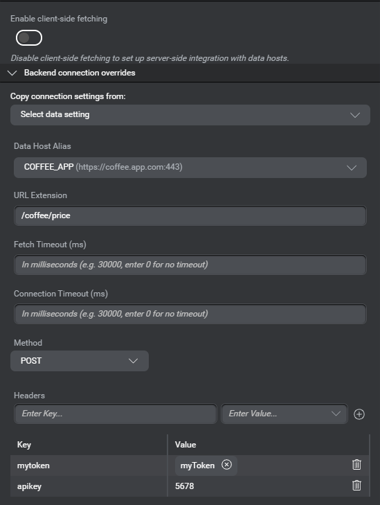 Otherwise, if your data access node must communicate directly with an external data host, turn off Enable client-side fetching, under Integration, and use the fields that appear to configure server-side integration.