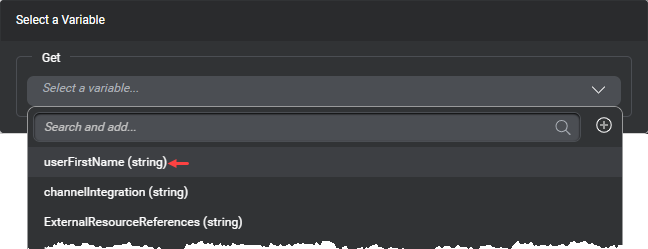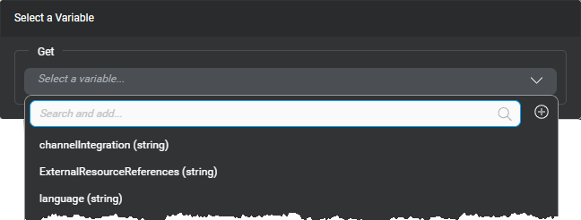 You can now choose the new variable. Unless the variable is meant to be of type string (default), remember to use the Variables resource panel to complete its definition. See Manage variables.