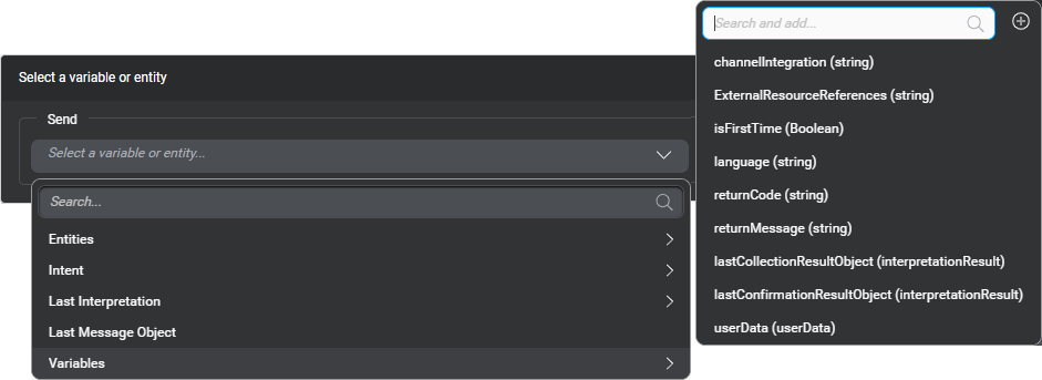 In the Send data section of data access nodes and external actions nodes, you can create input variables directly from the search field at the top of the Variables list. This feature is also available from the Send data section of question and answer nodes.