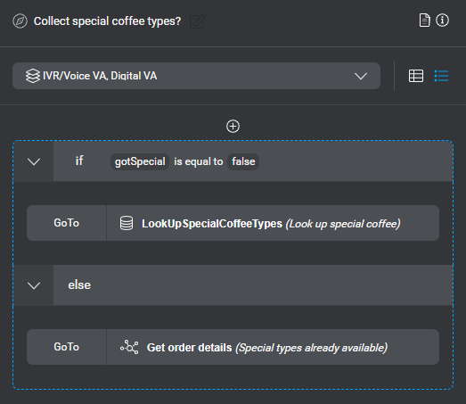 You might also use a decision node after a data access node, to check whether information was actually returned (that is, not null) and whether some entities collected so far for the active intent need to be cleared and collected again—for example if you look up a product and the data access node returns a Boolean variable indicating this product is momentarily unavailable at the specified location, your design might allow the user to choose a different location, in which case you would clear the entity that represents the location and collect it again.