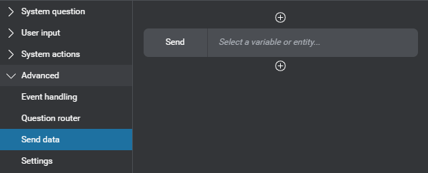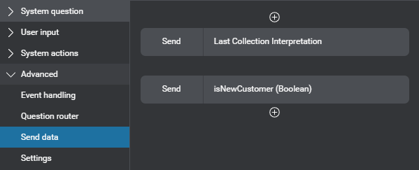 At runtime, the Dialog service sends any parameters you specified in this section to the client application, at every applicable step of the question and answer node: collection, confirmation, recovery, system actions.- Expand Advanced and click Send data.