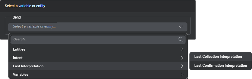 You can send a variable, an entity, messages from the last visited message node or from the latest step of this question and answer node (Last Message Object), the active intent’s value, confidence score, and literal, or the interpretation results from the last collection and confirmation steps (see Predefined variables for more details).