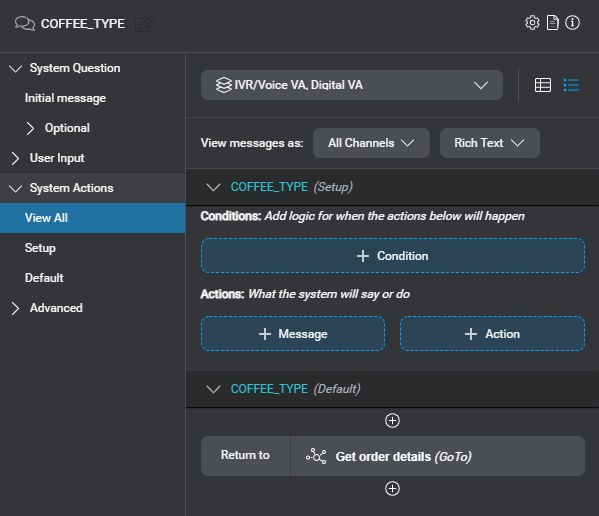 If this node is meant to collect a Boolean entity, a yes/no entity, a list entity that requires value-specific actions, or if it supports command overrides, the System Actions section allows you to set messages and actions, separately, for specific values of the entity in focus and for command override values.