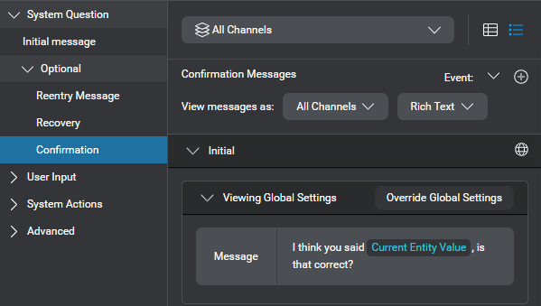Unlike the default recovery behavior for recognition events at the collection phase of a question and answer node, dialog applications do not repeat the confirmation initial message, after recovery messages for recognition events at the confirmation phase of question and answer nodes.- Expand System Question, then expand Optional, and click Confirmation.
