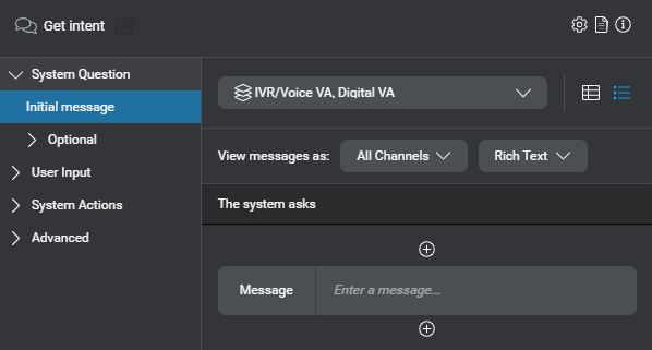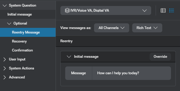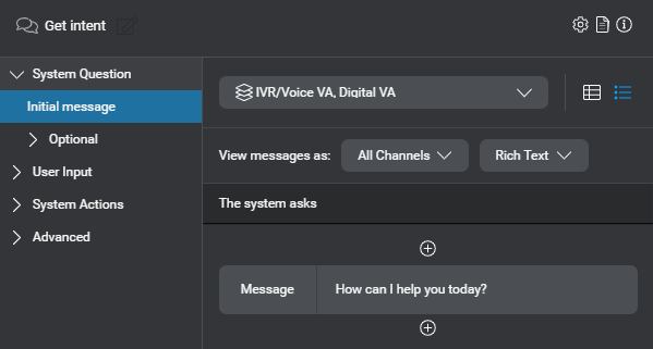 Configure messages to invite the user to say something—for example, How can I help you today? or Where are you flying from? You can set channel-specific or conditional messages separately. For example, you might want a different wording for the system question, depending on the channel.