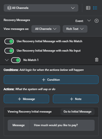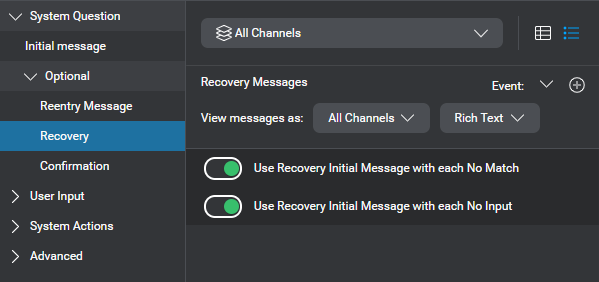 By default, dialog applications use the initial message set for a node, after any applicable global or channel-specific recovery messages. If you haven’t modified your project settings, both related switches are turned on, in this node’s properties. - If the local recovery behavior must be limited to a specific channel, choose the desired channel.