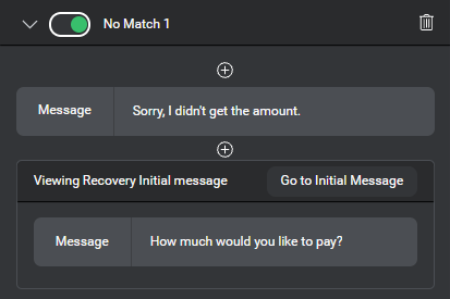 - If you do not want to use the initial message after the message set for a nomatch event, at this specific node, turn off Use Recovery Initial Message with each No Match.