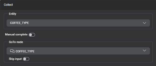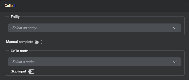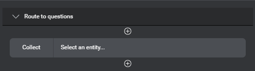 A new Collect placeholder appears. - Click the placeholder, and use the selectors in the editor that appears, as described above, to add a question and answer node for the next piece of information to be collected.
