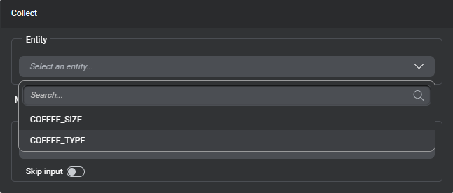- Expand the Entity list, and choose the first piece of information to be collected—for example, COFFEE_TYPE.