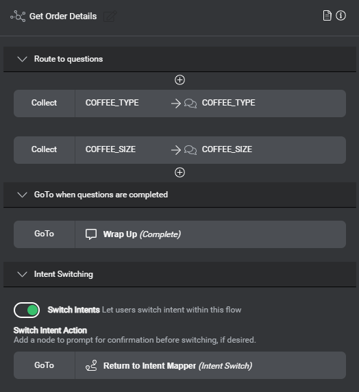 Under GoTo when questions are completed, click the GoTo placeholder, and set the desired transition. In the context of an intent component, you might: