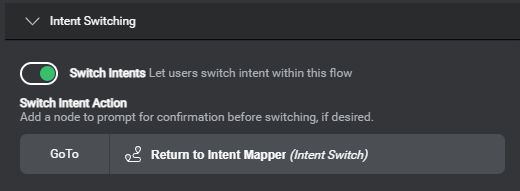 In a component that has a question router node handling entity collection, you can choose to allow or prevent intent switching. For example, in a banking app, a user who wants to pay a bill and has started providing the required information might suddenly ask how much money they have in a specific account. By default intent switching is enabled, and when a user says something that is recognized as a different intent, at a question and answer node, the dialog flow uses the Intent Switching transition of the question router node that handles entity collection for the active intent, to eventually return to the upstream intent mapper. Any entities collected so far for the active intent persist, unless you add actions to clear them before switching.