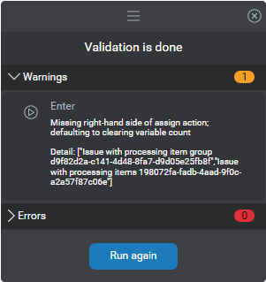The validation panel appears in the main pane. - Expand Warnings (or Errors) to see the list of issues.
