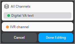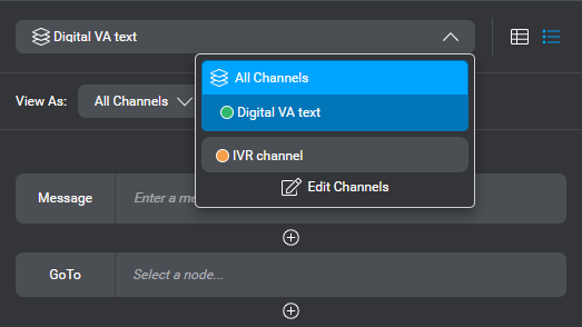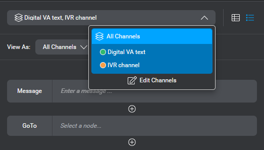 In Mix.dialog, when you need to use a different message or set different actions, depending on the channel, you can undock a channel at any node where you want the dialog to support channel-specific messages and actions, or interactive elements. The Messages resource panel also allows you to set channel-specific variations for your messages.
