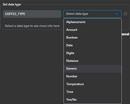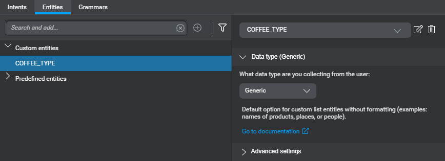 . - Select the desired data type for this entity (for example, Generic), from the list that appears in the upper-right area of the panel.