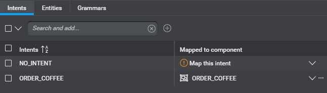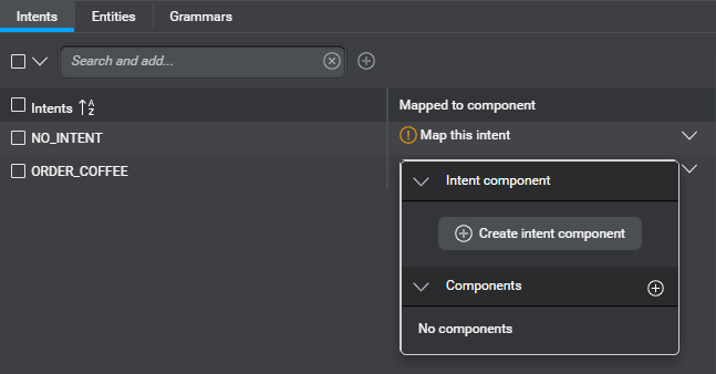 The new intent appears in the mapping table. - Next to ORDER_COFFEE, click Map this intent, and choose Create intent component.