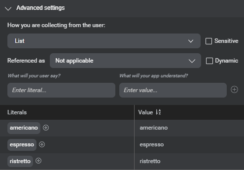 - Use the fields at the bottom of the Advanced settings section to add a few representative literal-value pairs—for example, enter literals espresso, ristretto, americano.