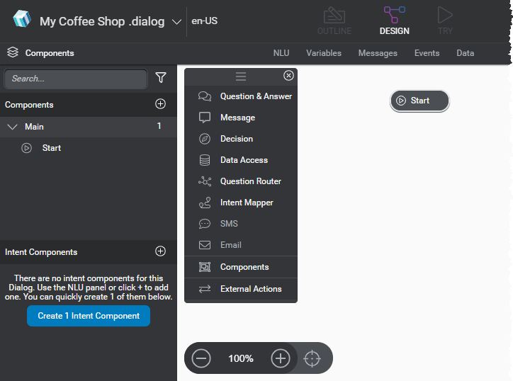 Mix.dialog opens with the DESIGN tab in focus, showing a Start node on a blank canvas in the center pane.