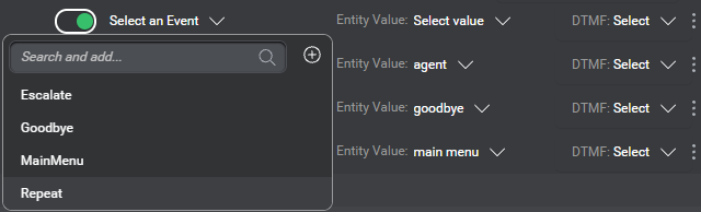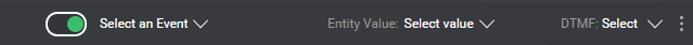 Tip: Use the search field to narrow down the list if needed. If your project does not yet have the desired event, you can create it on the fly. - Choose the corresponding entity value, and a DTMF key if your project supports DTMF interaction.