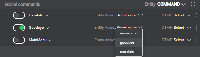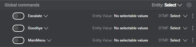 For your application to support global commands, you must reserve an entity to hold the recognized command values you want your application to support. Three predefined events—Escalate, MainMenu, and Goodbye—are available, which you can map to specific values of your global command entity. To support additional commands, you must add both a custom event and the command entity value meant to trigger the event.