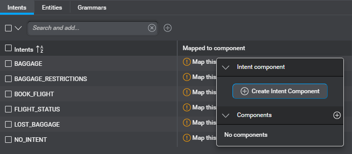 An intent component is a special type of component meant to handle one specific intent. Intent components are always named after the intent they handle. You can create an intent component from the Components pane, or add it on the fly when mapping intents.