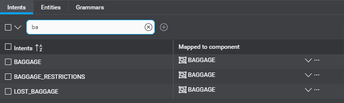 The panel updates as you type, to show only the mappings where the intents, intent components, or generic components match the search string.
