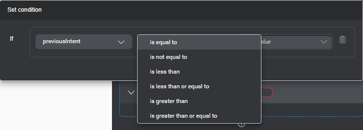 Tip: Use the search fields to narrow down the list if needed. If a variable you want to use is missing, you can create it on the fly. - (Optional) Replace the default comparison operator (is equal to) with another one (such as is not equal to, is less than, and so on), if needed.