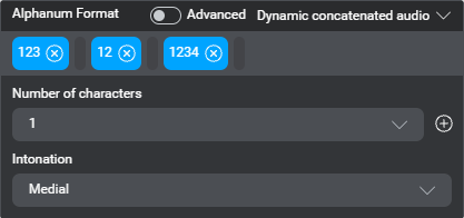 Set a pattern to play groups of characters of specified length. The default format is 123 12 1234, that is: 3 characters, pause, 2 characters, pause, 4 characters.