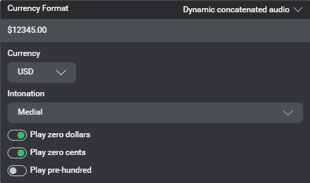 | Play pre-hundred | Available for English (United States) only: Turn on to use different audio recordings for hundreds prior to millions/thousands, and for hundreds prior to tens; turn off (default) to use the same audio recording for hundreds regardless of their position in amounts. |