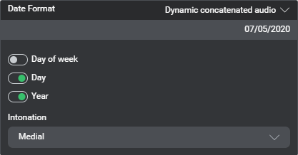 The order that the specified date parts are played at runtime is determined by the recorded audio package for the session language. Dynamic concatenated audio playback always includes the month.