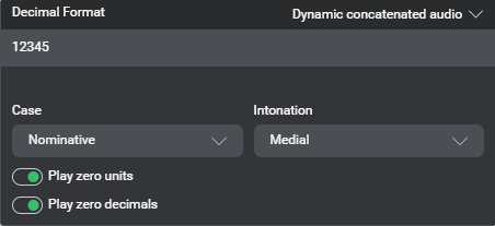 | Play zero decimals | Turn on (default) to play “point zero” (in the session language), when the value after the decimal point (or comma) is zero. |
