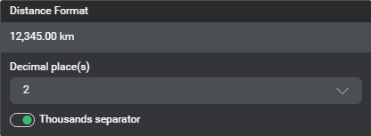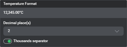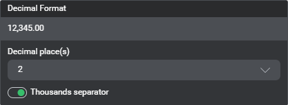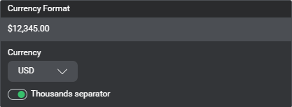 | Thousands separator | Turn on (default) to show the value with the applicable thousands separator; turn off to show the value without thousands separator. |