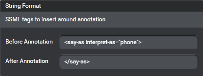 | Before Annotation | Freeform SSML tag to insert before the annotation (for example, <say-as interpret-as="phone">). |