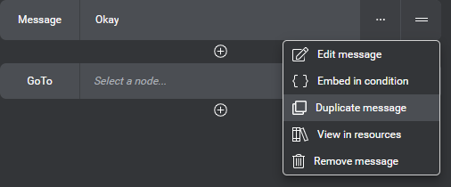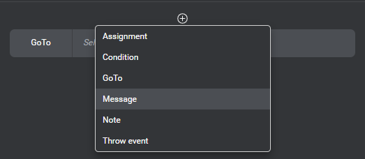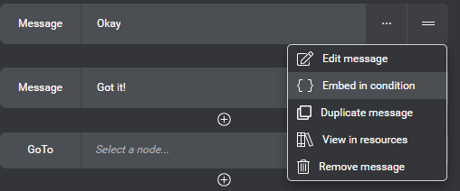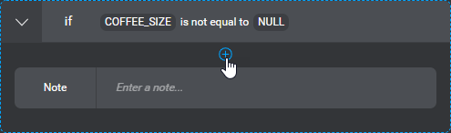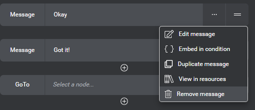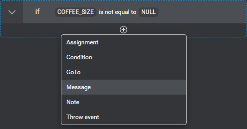 - To add a message under a condition where other messages, notes, actions, or conditions already exist, bring your pointer to the area where you want insert the message, click the Add icon