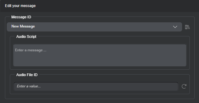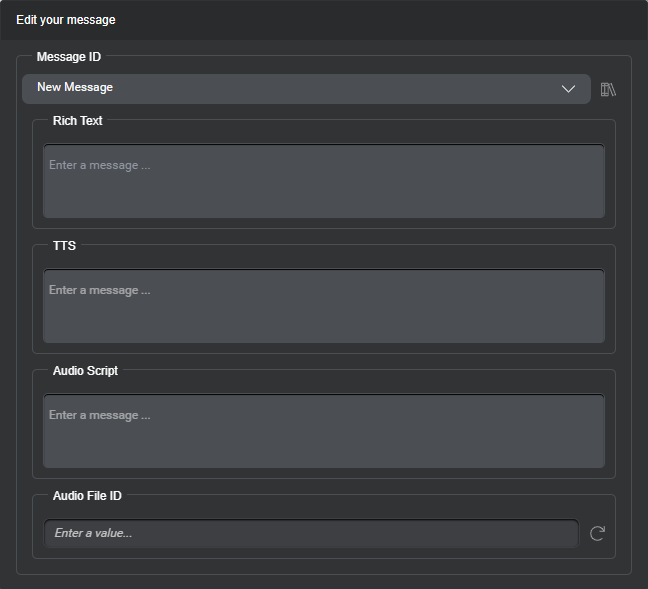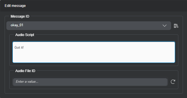 Enter the desired default text, annotations (if this message requires dynamic elements), and any modality-specific variations in the corresponding fields. You can also generate or specify the audio file ID, if needed (see Naming guidelines).