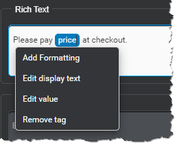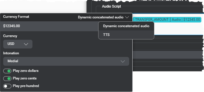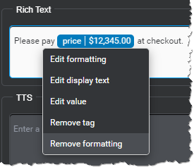 A format editor with applicable formatting options (for the data type, active language, and message format) appears. - If you are editing an Audio Script message, in a language that supports dynamic concatenated audio playback, choose the desired playback mode for this annotation: TTS or Dynamic concatenated audio.
