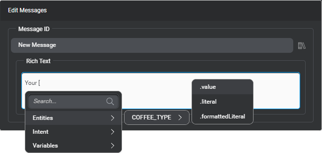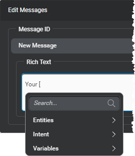 - Expand the appropriate category: Entities, for an entity; Intent, for the active intent; or Variables, if you want insert the placeholder for a variable.