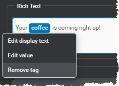 Depending on the type of element, you might have to choose between different attributes, such as the element’s value or literal, its length, and so on (see Supported methods). For variables and entities that support output formatting, you can choose Formatted value (and then customize the format, if desired). - The name of the dynamic element you chose appears as highlighted text in your message.