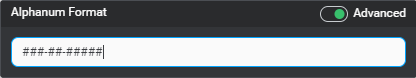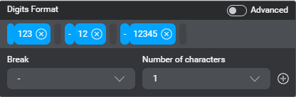 By default, the format editor for alphanumeric values or digits contains a default pattern, showing groups, such as 123-12-12345. Each group can have up to 9 characters. The Rich Text format supports a leading character and delimiters between groups. For TTS and dynamic concatenated audio playback, the space between groups represents a pause.