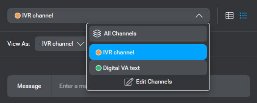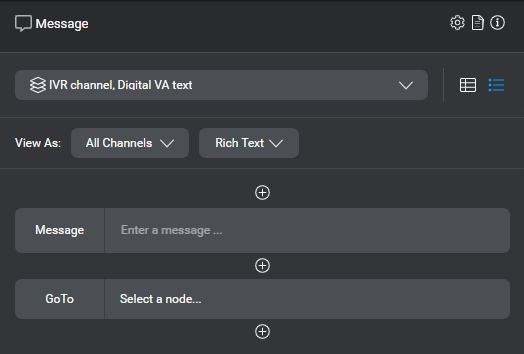 In most contexts where messages appear in the Node properties pane, a pair of View messages as selectors allow you to view message variations, by channel and output modality, directly on the compact messages—for example, to review the TTS version of the messages for the Digital VA voice channel. Once you have selected a modality, your selection persists as long as the current channel supports it. If you switch to a context where the applicable channel doesn’t support the selected modality, the modality selector falls back to the first output modality available for the current channel. For example, if you’re viewing default Audio Script messages, and then switch to the Digital VA text channel, the modality selector will fall back to Rich Text, because this channel doesn’t support Audio Script. Navigating to another node always resets the View messages as channel selector to All channels.