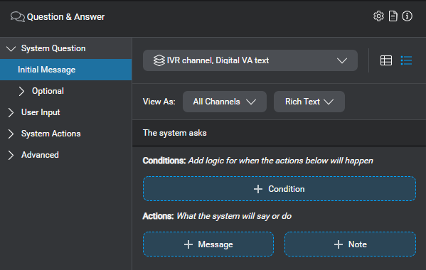On the other hand, for a new question and answer node, you must explicitly add the initial placeholder for setting the system question.